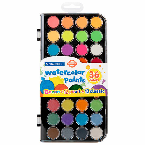 Краски акварельные BRAUBERG "PREMIUM" 36 цветов (12 базовых + 12 неоновых + 12 металлик) пенал