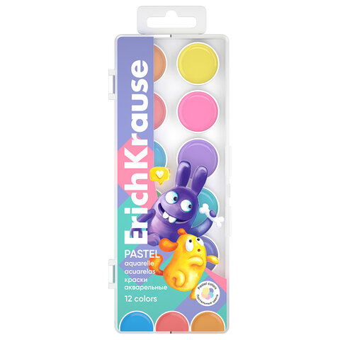 Краски акварельные ERICH KRAUSE "Jolly Friends Pastel", 12 цветов, пластиковый пенал, европодвес