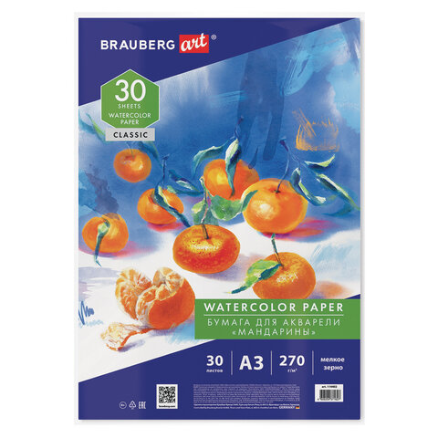 Бумага для акварели А3, 30 л., 270 г/м2, мелкое зерно, BRAUBERG ART CLASSIC, "Мандарины"