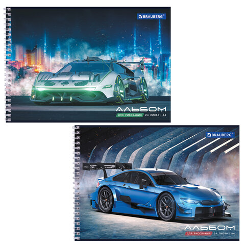 Альбом для рисования А4, 24 листа, гребень, обложка картон, BRAUBERG, 195х285 мм, "Спорткар" (2 вида)