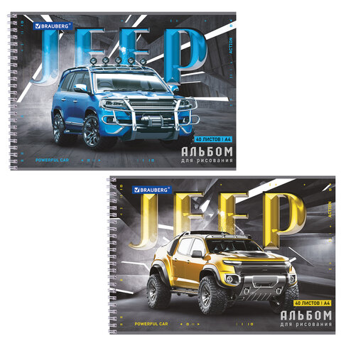 Альбом для рисования, А4, 40 листов, гребень, обложка картон, BRAUBERG, 195х285 мм, "Джипы" (2 вида)