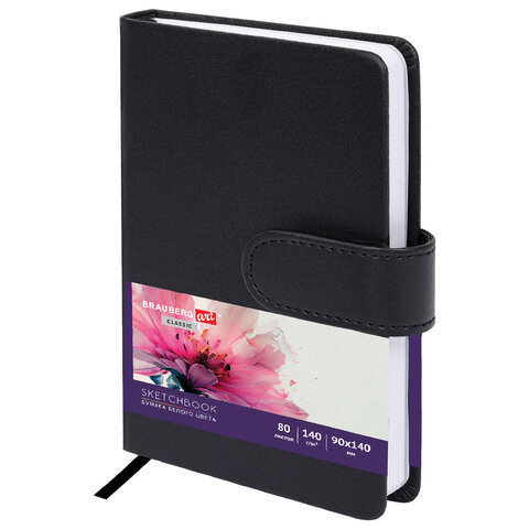 Скетчбук, белая бумага 140 г/м2 90х140 мм, 80 л., КОЖЗАМ, застежка, BRAUBERG ART CLASSIC, черный