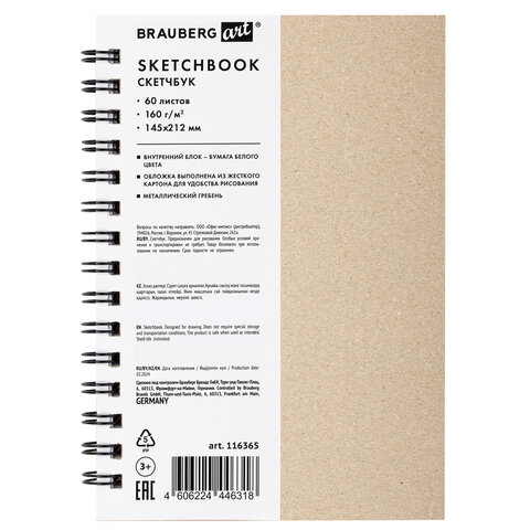 Скетчбук, белая бумага, 160 г/м2, плотная, 15х21 см, 60 л., гребень, твердая обложка, КРАФТ, BRAUBERG ART CLASSIC