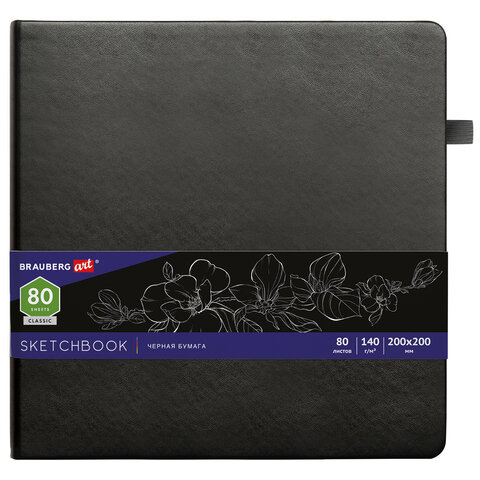 Скетчбук, черная бумага 140 г/м2, 200х200 мм, 80 л., КОЖЗАМ, резинка, карман, BRAUBERG ART CLASSIC, черный