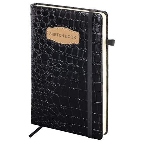 Скетчбук, слоновая кость 140 г/м2, 130х210 мм, 80 л., КОЖЗАМ, резинка, BRAUBERG ART CLASSIC, CROCO, черный
