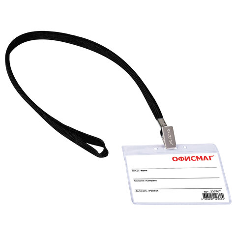 Бейдж горизонтальный (60х90 мм), на черной ленте 45 см, ОФИСМАГ