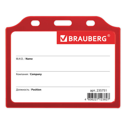 Бейдж горизонтальный жесткокаркасный (75х105 мм), без держателя, КРАСНЫЙ, BRAUBERG