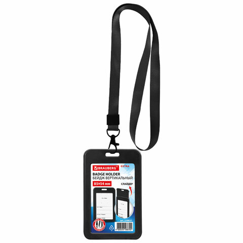 Бейдж вертикальный (85х54 мм), лента 45 см с карабином, СЛАЙДЕР, черный, BRAUBERG EXTRA