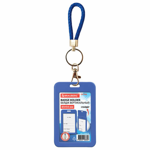 Бейдж вертикальный (85х54 мм), петля с карабином, СЛАЙДЕР, синий, BRAUBERG EXTRA