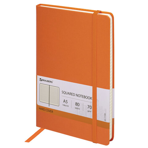 Блокнот А5 (148x218 мм), BRAUBERG "Metropolis", балакрон, 80 л., резинка, клетка, оранжевый