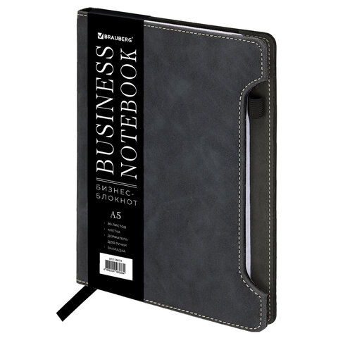 Блокнот А5 165x218 мм, BRAUBERG "Perfect", под кожу софт-тач, держатель для ручки, 80 листов, клетка, черный