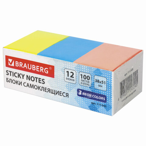 Блоки самоклеящиеся (стикеры) BRAUBERG 38х51 мм, 100 листов, НАБОР 12 штук, 3 неоновых цвета