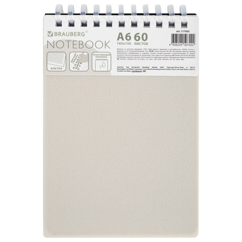 Блокнот МАЛЫЙ ФОРМАТ А6, 60 л., силиконовый гребень, обложка пластик, клетка, BRAUBERG, бежевый