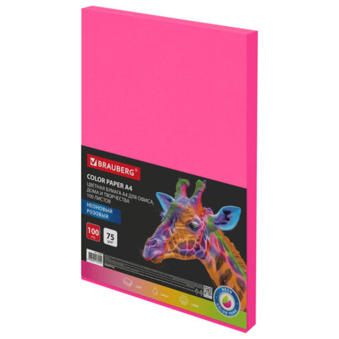 Бумага цветная BRAUBERG, А4, 75 г/м2, 100 л., НЕОН, розовая, для офисной техники