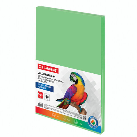 Бумага цветная BRAUBERG, А4, 80 г/м2, 100 л., интенсив, зеленая, для офисной техники