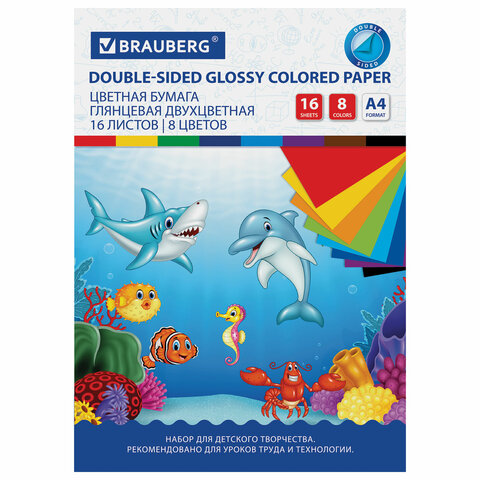 Цветная бумага А4 2-сторонняя мелованная (глянцевая), 16 листов 8 цветов, на скобе, BRAUBERG, 200х280 мм, "Морская"