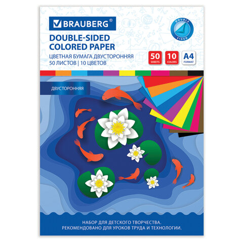 Цветная бумага А4 2-сторонняя офсетная, 50 листов 10 цветов, в папке, BRAUBERG, 200х280 мм, "Рыбки"
