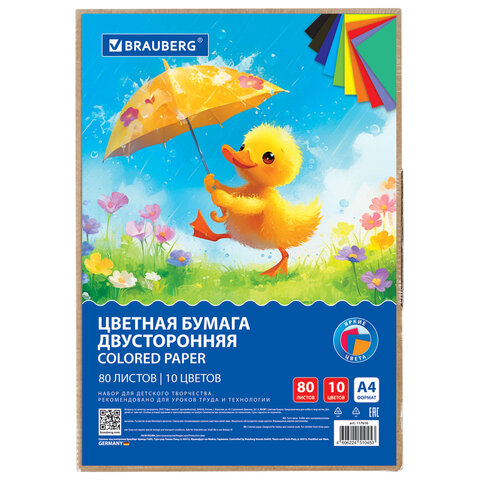 Цветная бумага А4 ТОНИРОВАННАЯ В МАССЕ, 80 листов, 10 цветов, короб, 80 г/м2, BRAUBERG, 210х297 мм
