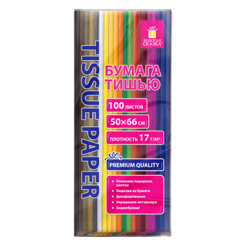 Цветная бумага ТИШЬЮ 17 г/м2, 50х66 см, 100 листов, 20 цветов, интенсив ассорти, ЗОЛОТАЯ СКАЗКА