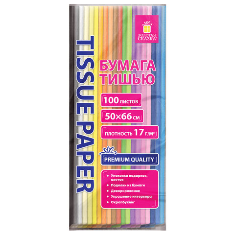 Цветная бумага ТИШЬЮ 17 г/м2, 50х66 см, 100 листов, 20 цветов, пастель ассорти, ЗОЛОТАЯ СКАЗКА
