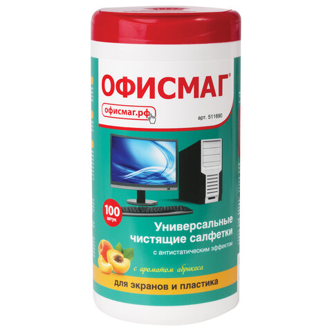 Салфетки для экранов всех типов и пластика ОФИСМАГ с ароматом "АБРИКОС", туба 100 шт., влажные