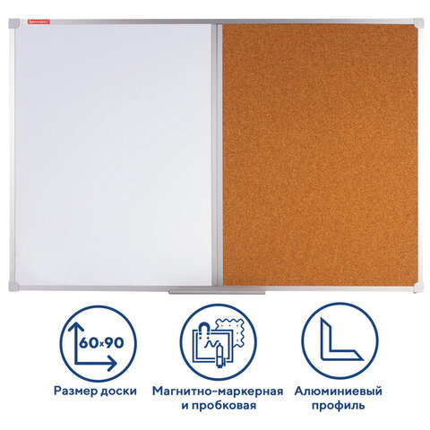 Доска комбинированная: магнитно-маркерная, пробковая для объявлений, 60х90 см, РОССИЯ, BRAUBERG