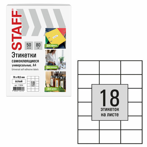 Этикетка самоклеящаяся 70х49,5 мм, 18 этикеток, белая, 80 г/м2, 50 листов, STAFF BASIC
