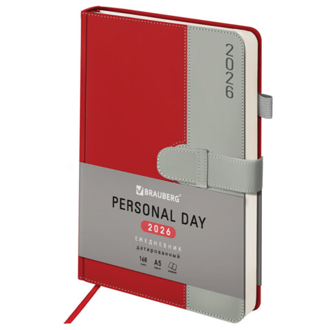 Ежедневник датированный 2026, А5, 138х213 мм, BRAUBERG "Esthetic", под кожу, держатель для ручки, застежка, красный/серый