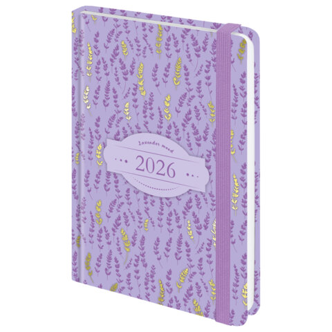 Ежедневник датированный 2026 с резинкой 145х203 мм, А5, BRAUBERG твердый, фольга, "Лаванда"
