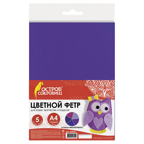 Цветной фетр МЯГКИЙ А4, 2 мм, 5 листов, 5 цветов, плотность 170 г/м2, оттенки фиолетового, ОСТРОВ СОКРОВИЩ