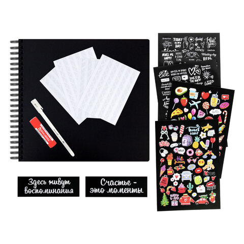 Фотоальбом 30х32 см, 48 черных листов, уголки, стикеры, ручка, клей, BRAUBERG Black Line