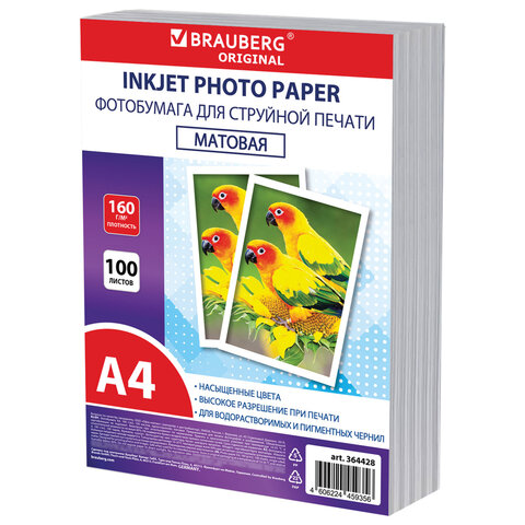 Фотобумага матовая, А4, 160 г/м2, односторонняя, 100 листов, ПАКЕТ, BRAUBERG ORIGINAL