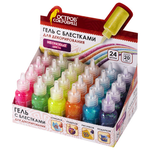 Гель с блестками ОСТРОВ СОКРОВИЩ, для декора, поделок, DIY, творчества, оформления, 20 мл, НЕОН, цвета ассорти, в дисплее