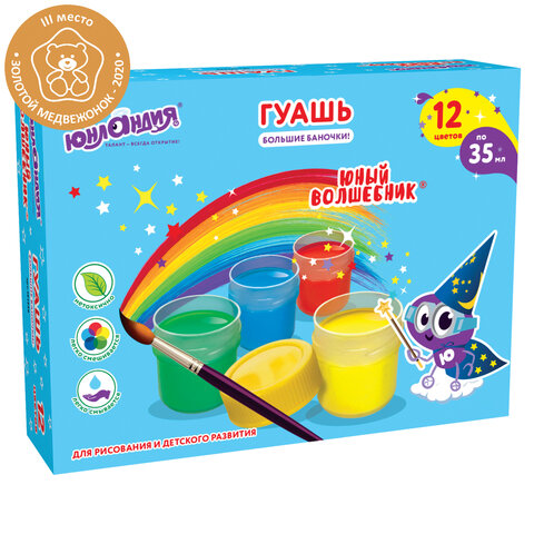 Гуашь ЮНЛАНДИЯ "ЮНЫЙ ВОЛШЕБНИК", 12 цветов по 35 мл, БОЛЬШИЕ БАНОЧКИ, высшее качество