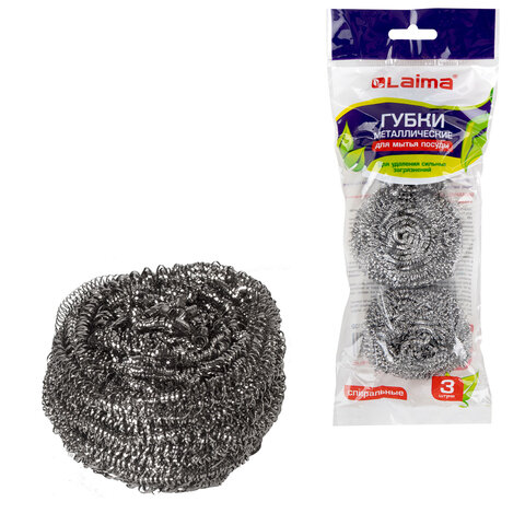 Губки (мочалки) металлические, спиральные, 3х20 г, КОМПЛЕКТ 3 шт., для посуды, гриля, плиты, LAIMA