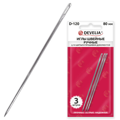 Иглы для шитья и прошивки документов D-120 ручные (цыганские), длина 80 мм, 3 штуки, DEVELIA