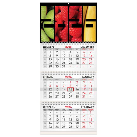 Календарь квартальный на 2026 г., 3 блока, 3 гребня, бегунок, офсет, BRAUBERG, "Фрукты"