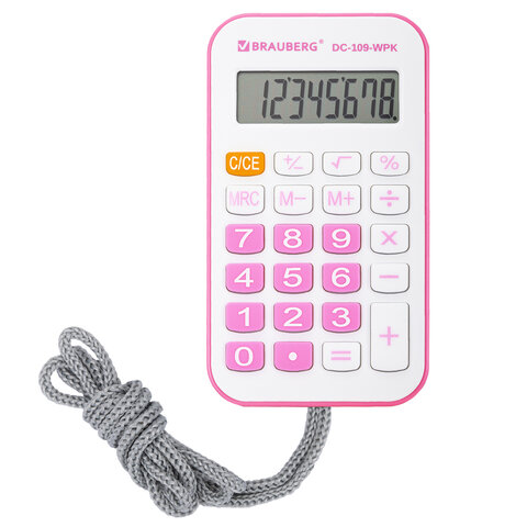 Калькулятор карманный со шнурком BRAUBERG DC-109-WPK (61x110 мм), 8 разрядов, БЕЛЫЙ/РОЗОВЫЙ