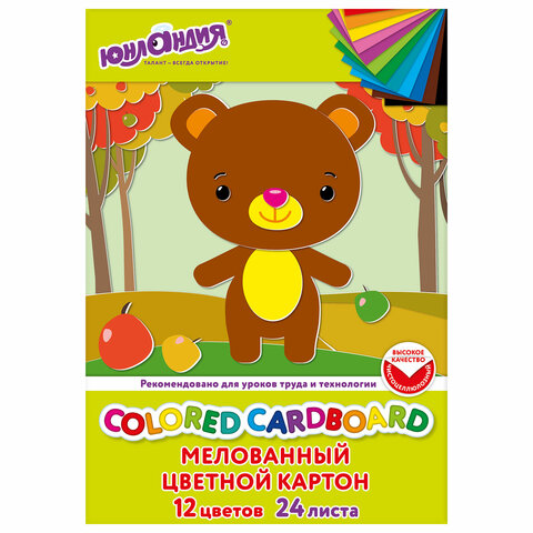 Картон цветной А4 МЕЛОВАННЫЙ, 24 листа, 12 цветов, в папке, ЮНЛАНДИЯ, 200х290 мм