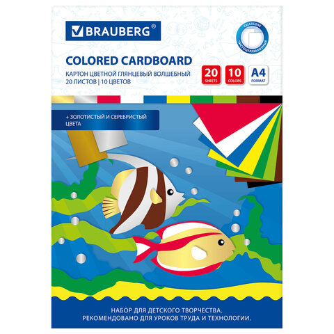 Картон цветной А4 МЕЛОВАННЫЙ ВОЛШЕБНЫЙ, 20 листов, 10 цветов, в папке, BRAUBERG, 200х290 мм