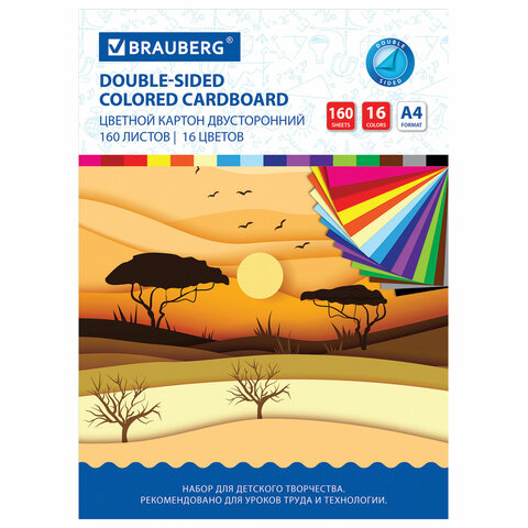 Картон цветной А4 ТОНИРОВАННЫЙ В МАССЕ, 160 листов, 16 цветов, 180 г/м2, BRAUBERG