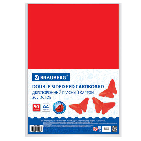 Картон цветной А4 ТОНИРОВАННЫЙ В МАССЕ, 50 листов, КРАСНЫЙ, 220 г/м2, BRAUBERG, 210х297 мм