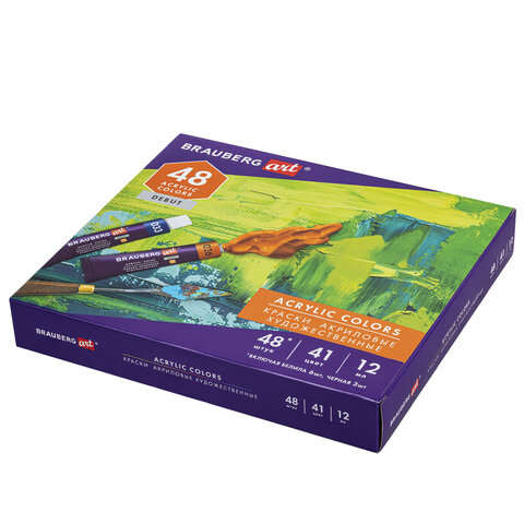 Краски акриловые художественные, НАБОР 48 штук, 41 цвет по 12 мл, в тубах, BRAUBERG ART DEBUT