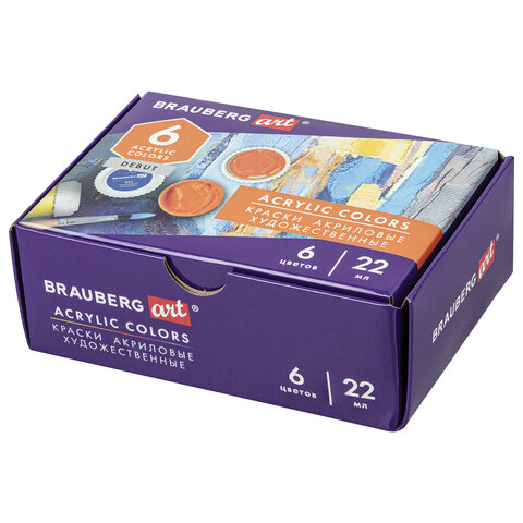 Краски акриловые художественные, НАБОР 6 штук по 22 мл в банках, BRAUBERG ART DEBUT