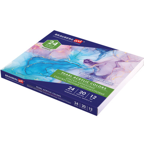 Краски акриловые художественные ПЕРЛАМУТРОВЫЕ, НАБОР 24 шт., 20 цветов в тубах 12 мл, BRAUBERG ART