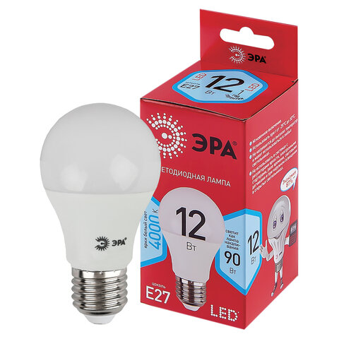 Лампа светодиодная ЭРА RED LINE, 12 (90) Вт, цоколь Е27, груша, нейтральный белый свет, 25000 ч., LED A60-12W-4000-E27, Б0049636