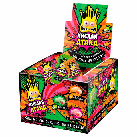 Конфета жевательная КИСЛАЯ АТАКА с кислым центром, ассорти 3 вкусов, 4,5 г, KA-1-1