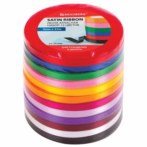 Лента атласная ширина 6 мм, набор 12 цветов по 23 м, BRAUBERG