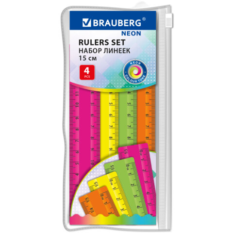 Линейки пластиковые 15 см неоновые BRAUBERG, НАБОР 4 штуки, непрозрачные, пенал