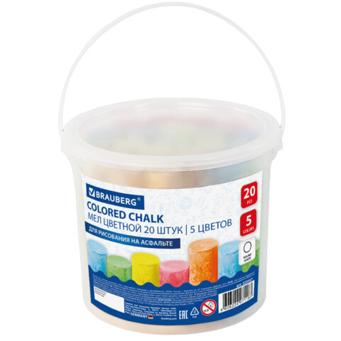 Мел в ведерке для рисования на асфальте 20 штук, 5 цветов, цветной круглый, BRAUBERG